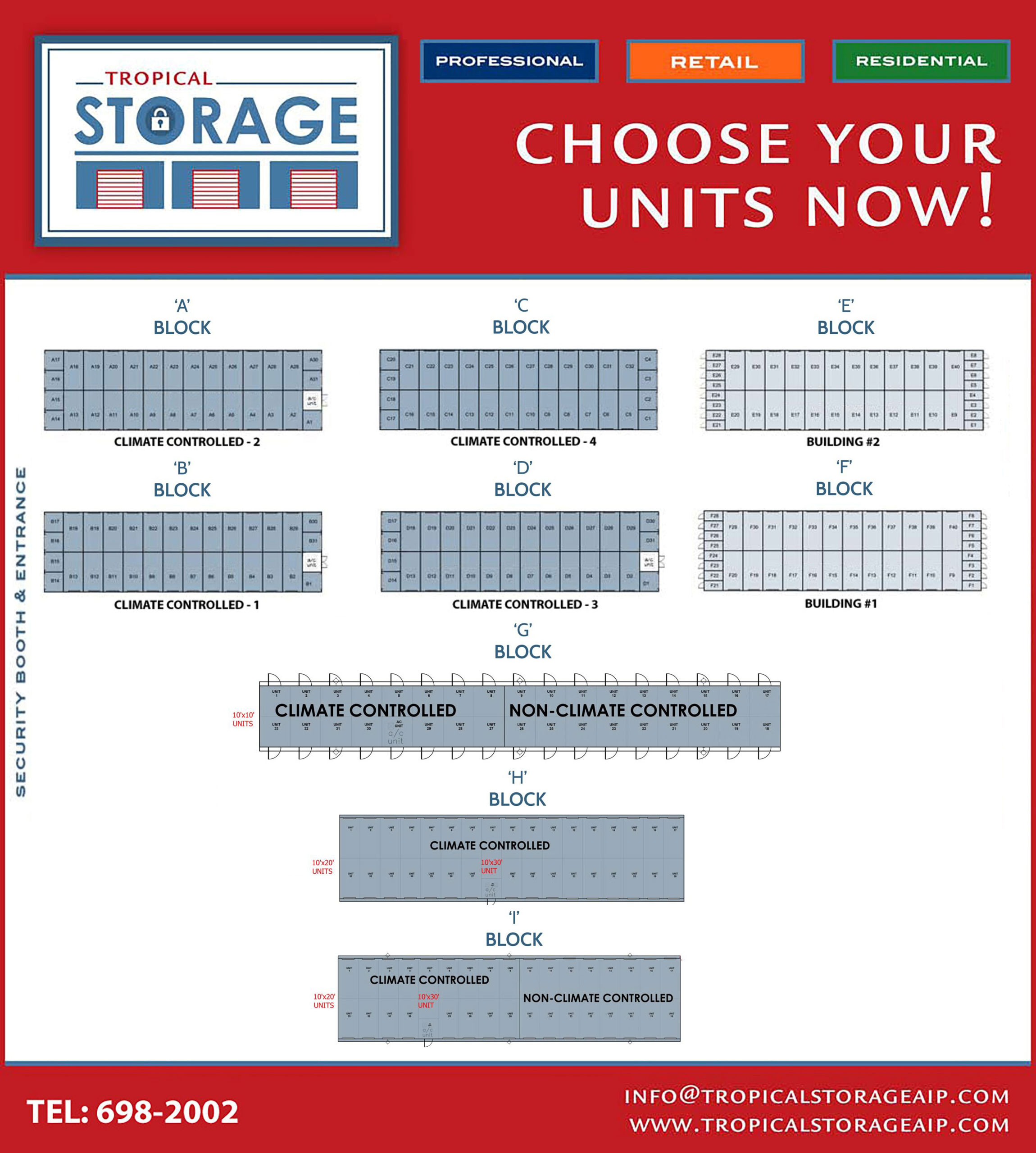 Need more space? Do you need a place to keep the files that are cluttering up the office. Tropical Storage can put your mind at ease with our fire resistant climate controlled units. Click here to reserve your unit.